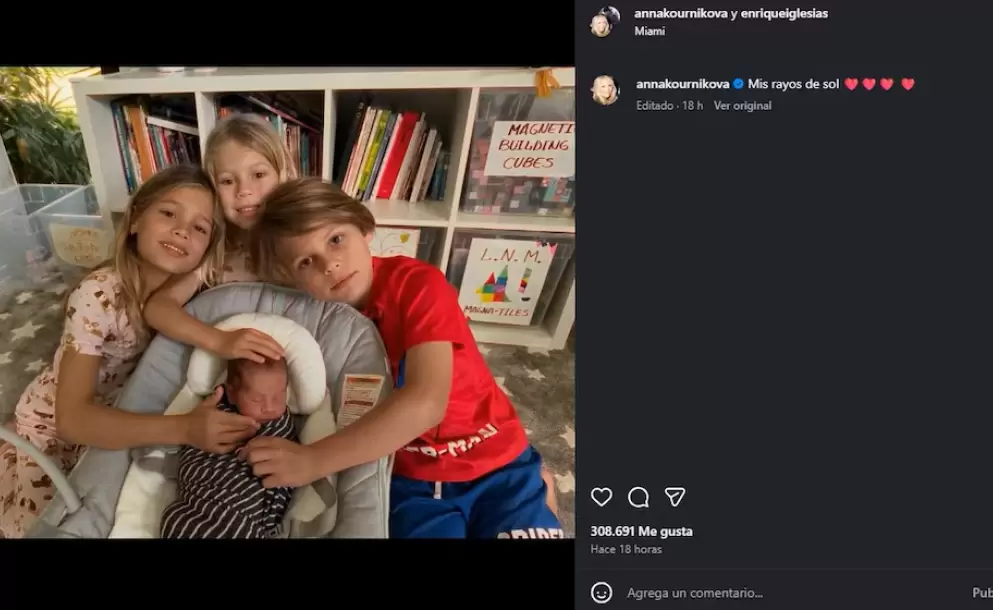 El bebé aparece en el centro de la imagen, aparentemente dormido, mientras sus hermanos mayores, los mellizos Lucy y Nicholas, de 8 años, y su hermana Mary, de 5 años, lo rodean con gestos de ternura. La emotiva imagen fue acompañada por un breve mensaje de Anna Kournikova: "Mis rayos de sol".