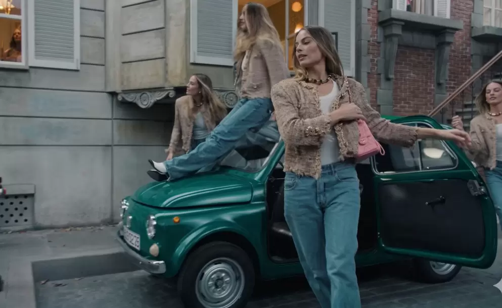 En el nuevo spot, varias versiones de la actriz recorren un set que simula una acera parisina, cada una portando un bolso Chanel 25 en diferentes colores y tamaños.