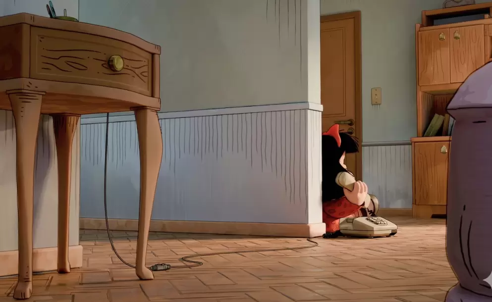 Netflix presentó la primera imagen oficial de la serie animada de Mafalda, en donde se ve al icónico personaje con su vestido rojo y lazo en el pelo del mismo color, escondida detrás de una pared hablando por teléfono.