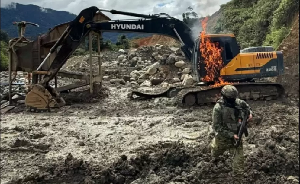El material neutralizado incluyó 4 excavadoras incineradas, 4 motores de succión industriales destruidos en sitio, 3 clasificadoras tipo Z y 3.000 galones de diésel eliminados, informó el Ejército.