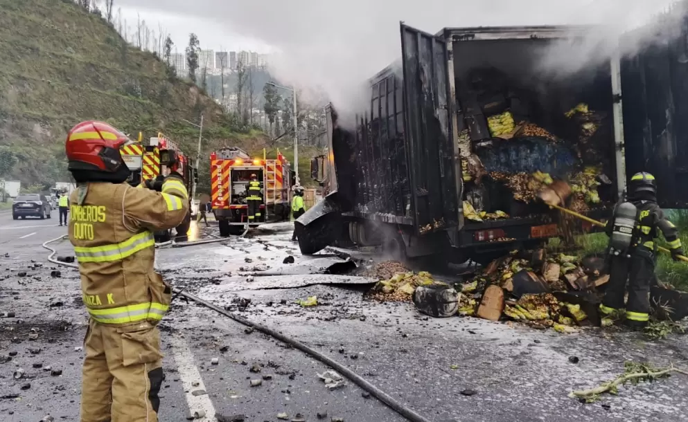 Un camión que transportaba diferentes materiales y alimentos se incendió en la Av. Simón Bolívar y Conquistadores, en el sector de Guápulo. Según el ECU 911, el hecho ocurrió luego de que se generó fuego en uno de los neumáticos del vehículo.