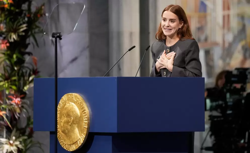 "Debo decir que mi madre nunca rompe una promesa. Y por eso, con toda la alegría de mi corazón, puedo decirles que en solo unas horas podremos abrazarla aquí en Oslo después de 16 meses", dijo Sosa, quien ocupó la silla destinada a su madre junto a los miembros del Comité Nobel noruego y con una foto de Machado como trasfondo.