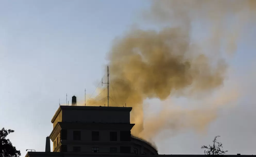 En fotografías difundidas por el DSNS se puede ver un incendio en las dos últimas plantas y salir humo de las ventanas rotas.