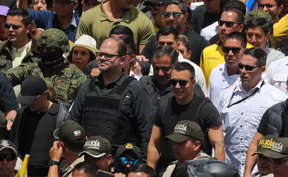 Noboa marchó portando un chaleco antibalas negro en medio de un fuerte contigente militar y la movilización comenzó pocos minutos después.