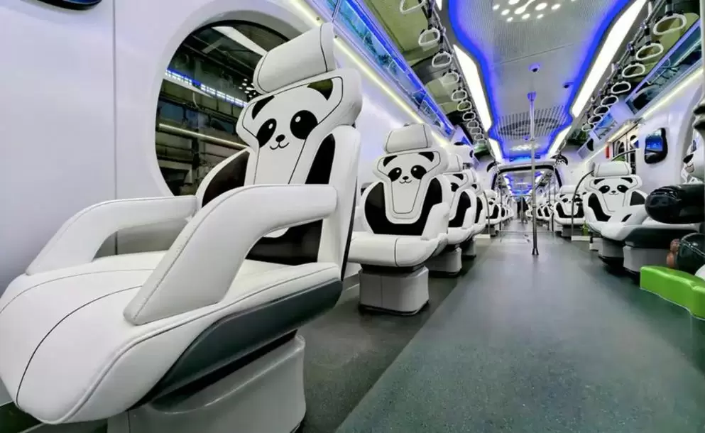 El interior del tren es todo un 'universo panda', ya que sus asientos de cuero son en forma de estos osos, cuenta con agarraderas con cabezas de panda y tiene vitrinas de recuerdos y una figura de panda de 1,5 metros, en donde los pasajeros se pueden tomar fotografías.