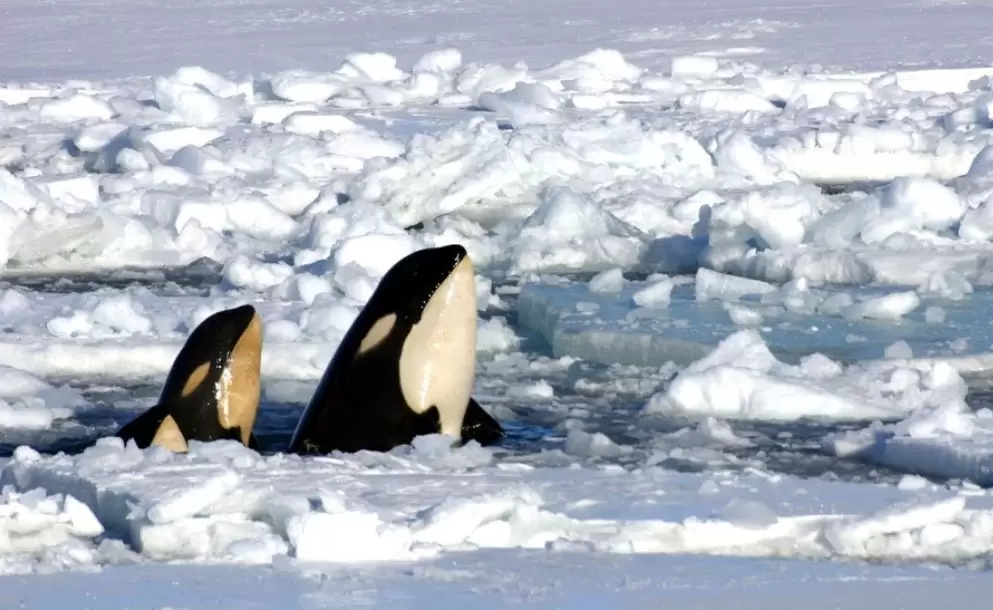 El contraste entre el azul profundo del océano, el blanco absoluto del hielo y las siluetas oscuras de las orcas crea una composición casi abstracta que revela la fragilidad y al mismo tiempo la resiliencia de la vida en uno de los ecosistemas más inhóspitos de la Tierra.